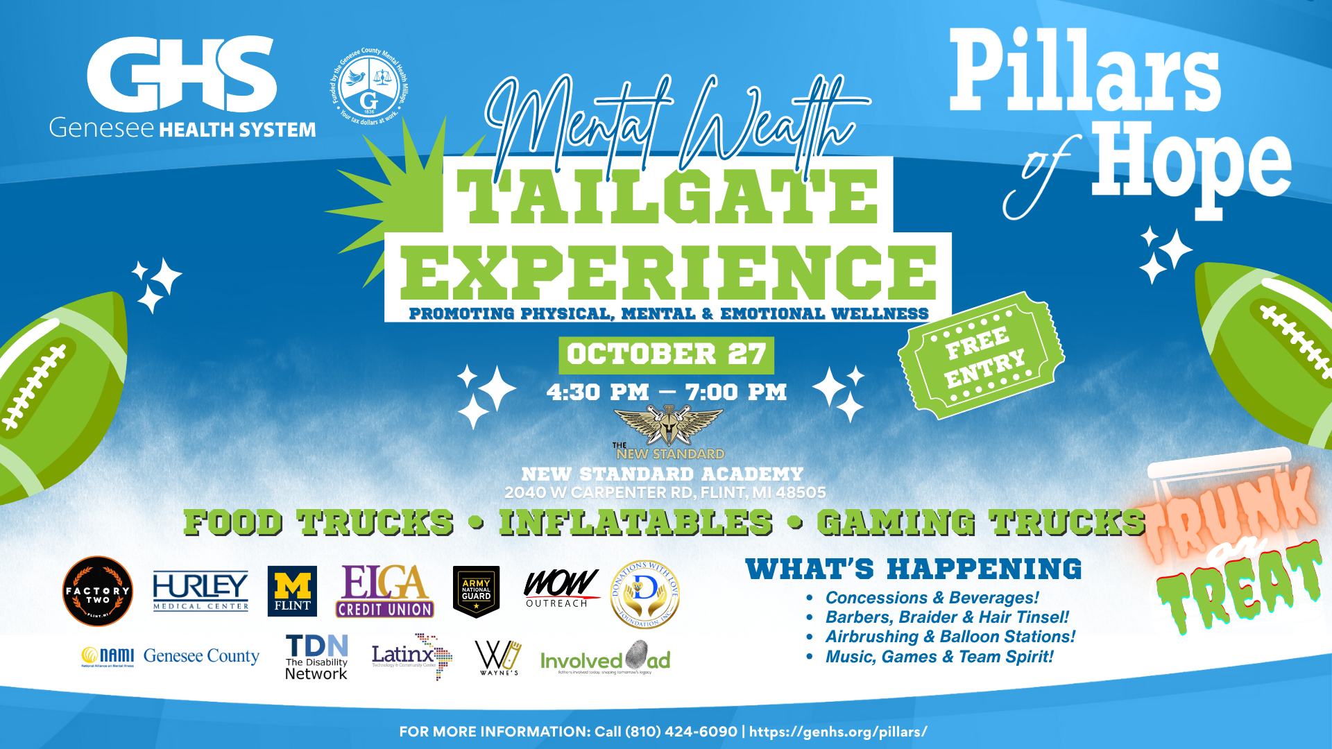 Genesee Health System (GHS) has partnered with New Standard Academy to host the Pillars of Hope: Mental Wealth Tailgate Experience on Monday, October 27, from 4:30 to 7:00 p.m. at New Standard Academy, 2040 W. Carpenter Rd., Flint, MI 48505.